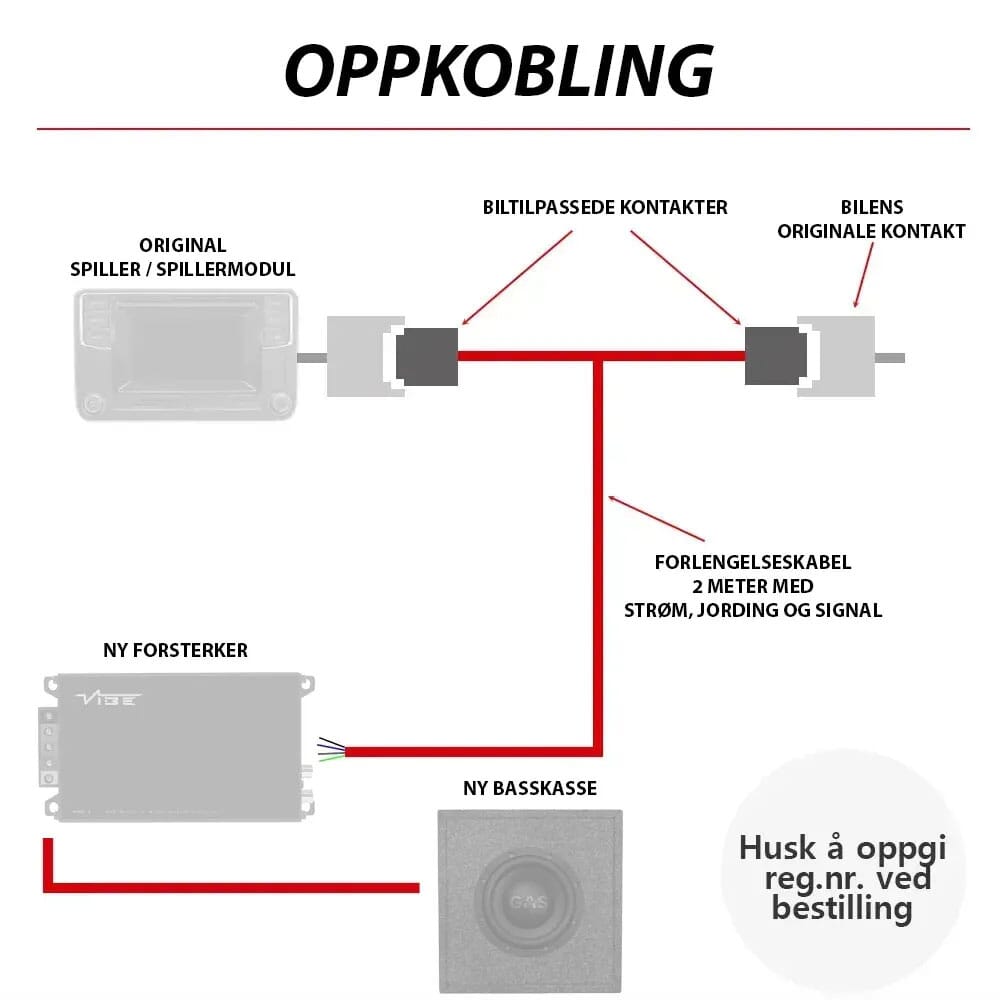 - Forsterker: Kobles inn bak original spiller / spillermodul i dashbord ved hjelp av medfølgende plug & play kabelsett.