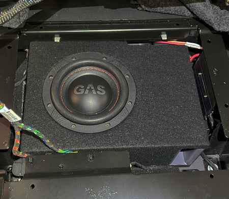Ny basskasse monteres inn under passasjerstol. Det samme gjør man med ny bassforsterker. Strømkabel strekkes skjult bort til 12V-batteri under førerstol. Signal til bassforsterker hentes med plug&play-kabelsett mot original forsterker, også den lokalisert under passasjerstolen.