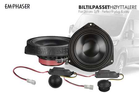 Hvis du vil oppgradere lyden i Fiat Ducato III, Ducato Series 8, Opel Movano C, Peugeot Boxer II eller Citroen Jumper II uten å gjøre noen endringer i bilen, vil du uunngåelig komme over EMPHASER EM-FTF2. De er akustisk perfekt tilpasset bilene og erstatter det original monterte høyttalerne uten for mye installasjonsarbeid. Alle komponenter passer perfekt inn i de respektive høyttalerfestene på førerdørene og kobles ganske enkelt til de originale pluggene. Så spenn deg fast og nyt favorittmusikken din eller til og med lydbøker i fantastisk stemmegjengivelseskvalitet på reisene dine.