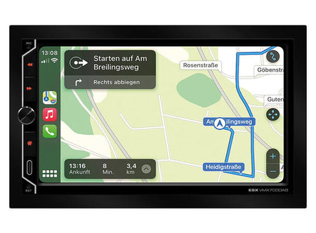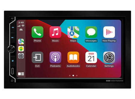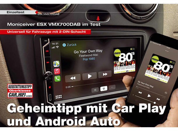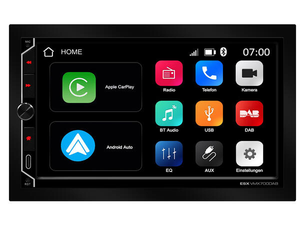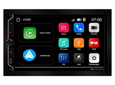 Den universelle ESX VMX700DAB tilbyr kompatibilitet med Apple CarPlay eller Android AutoTM (trådløst og via USB), en GPS-mottaker for optimalisert posisjonering i navigasjonsapplikasjoner, en mediespiller, Bluetooth for håndfrie samtaler og lydstrømming, 4 x 80 watt maks, musikkytelse og selvfølgelig alle essensielle USB- og RCA-innganger i kjøretøyet. Et stort ratt for volumkontroll og tre funksjonsknapper på kontrollpanelet og kompatibilitet med analoge rattfjernkontroller utfyller brukervennligheten til den nye ESX DAB+ radioen.