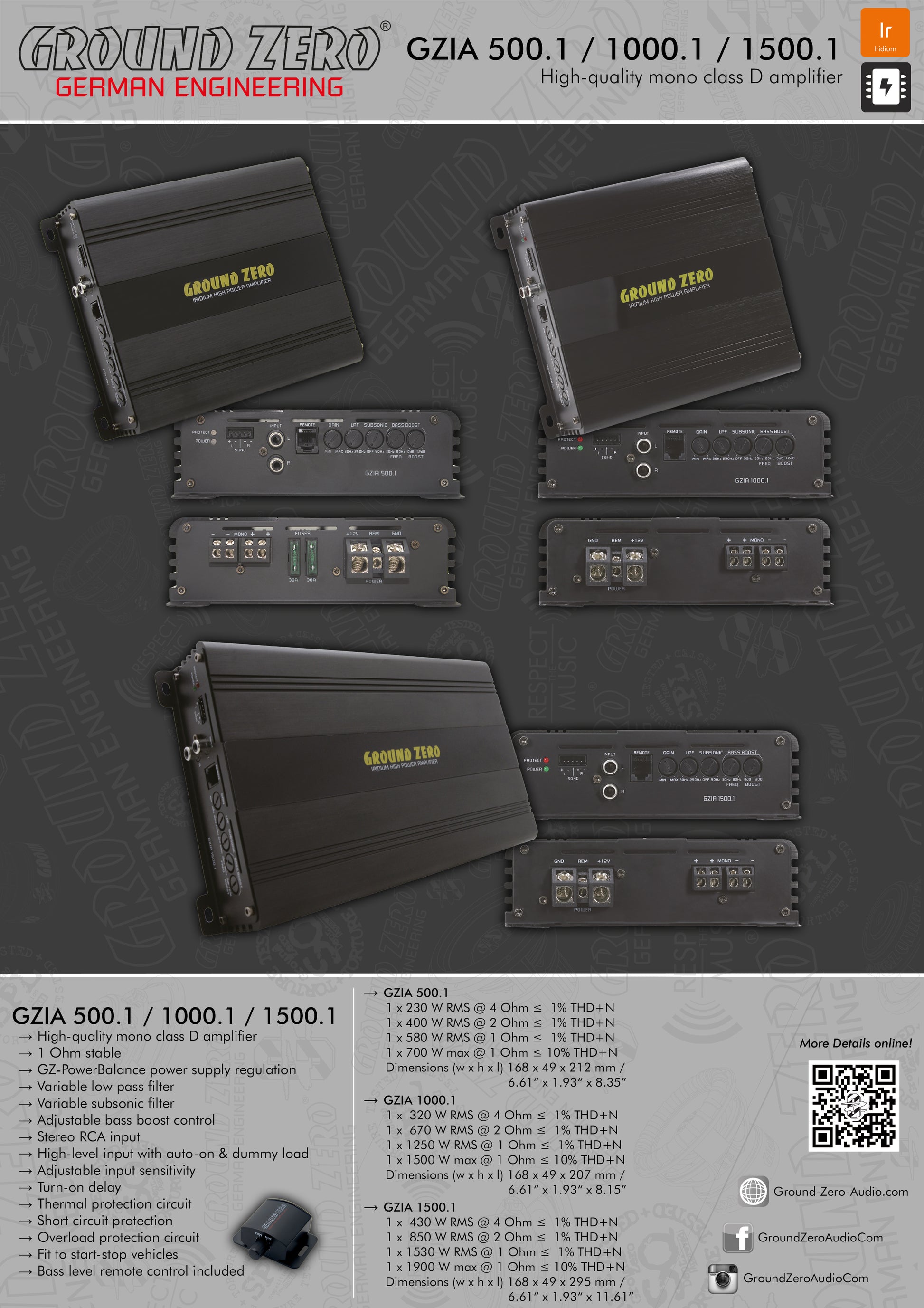 - Ground Zero sin meget populære IRIDIUM serie krymper i fysisk størrelse men selvsagt ikke i effekt! Høynivåinngangene er oppgradert med "dummy" belastningsmotstander for å omgå høyttalerdiagnostikk.