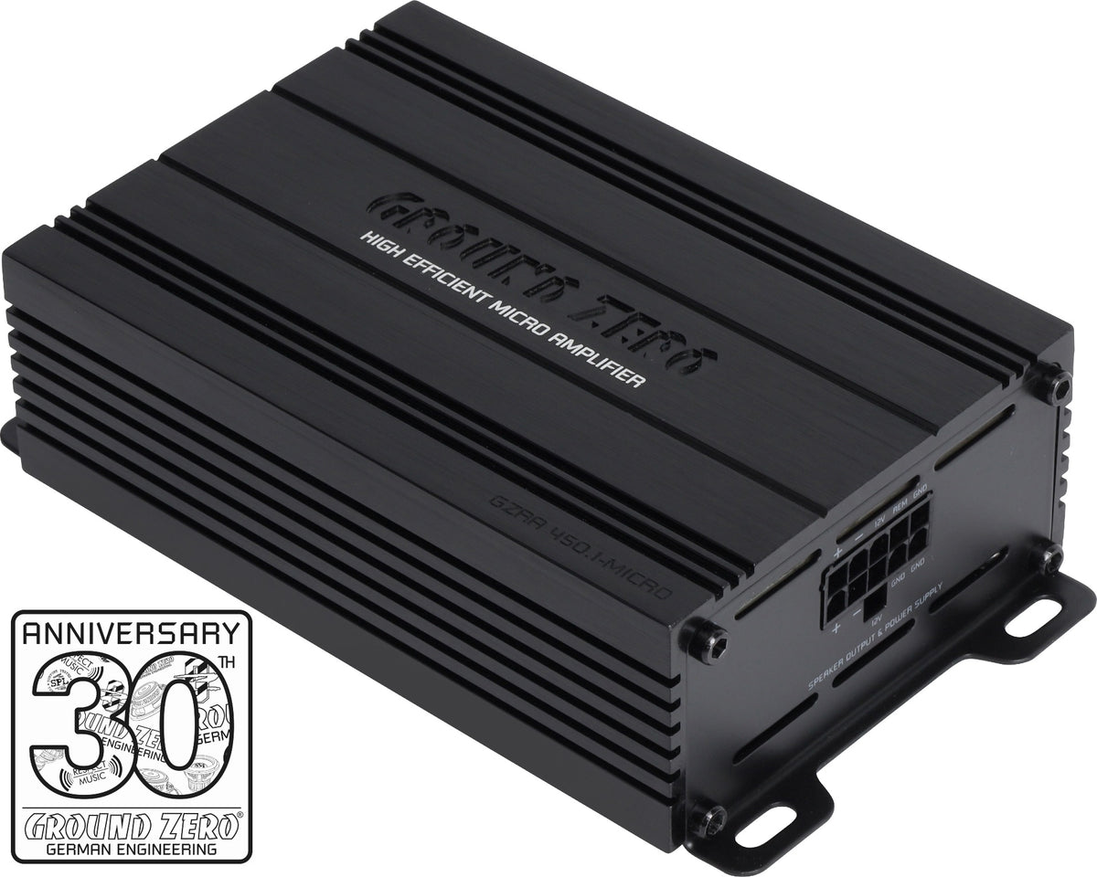 - Ground Zero GZRA 450.1-MICRO er en høyeffektiv ultrakompakt og kraftig klasse D monoblokk. Den har avansert høynivåinngang med "dummy" belastningsmotstander for å omgå høyttalerdiagnostikk så her trenger du ikke være redd for feilmeldinger fra bilens elektronikk.