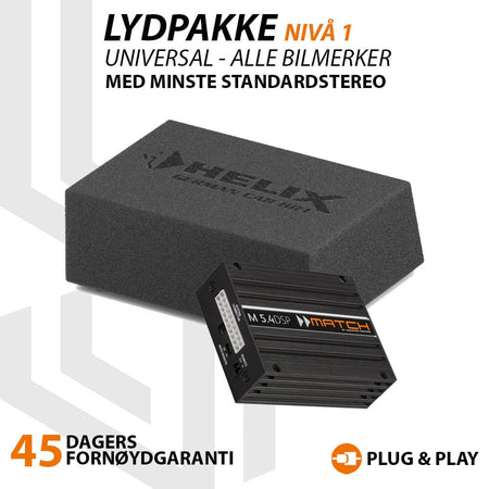 Forsterkeren benyttet i denne pakken kombinert med vår forhåndsjustering av forsterkerens integrerte DSP utgjør den store magien i en slik oppgradering. Her har vi brukt mye tid på oppmåling og justering av en DSP-fil spesielt tilpasset denne bilen, basert på utstyret som er montert. Match sin prisvinnende programvare for DSP-justering (DSP PC-Tool) innehar en bred equalizer, avanserte delefilter, avansert tidskorrigering o.s.v. Til din store fordel som kunde, så gir vi deg alltid muligheten til å påvirke ditt eget lydresultat når det monteres Match DSP-forsterker. Vi anbefaler å starte med vår forhåndsjusterte DSP-fil som utgangspunkt. Lyd er likevel en individuell smakssak som igjen kan oppleves ulikt alt etter fortrukken musikksjanger eller avspillingsmetode. Dersom du skulle ha innvendinger mot lydresultatet i din bil etter montering og bruk, så anbefaler vi deg å ta kontakt. Basert på dine tilbakemeldinger kan vi justere videre på DSP-filen, før ny versjon sendes til deg med forklaring om hvordan du overfører denne til Match-forsterker via egen PC.