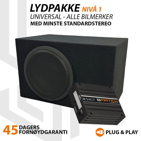 Forsterkeren benyttet i denne pakken kombinert med vår forhåndsjustering av forsterkerens integrerte DSP utgjør den store magien i en slik oppgradering. Her har vi brukt mye tid på oppmåling og justering av en DSP-fil spesielt tilpasset denne bilen, basert på utstyret som er montert. Match sin prisvinnende programvare for DSP-justering (DSP PC-Tool) innehar en bred equalizer, avanserte delefilter, avansert tidskorrigering o.s.v. Til din store fordel som kunde, så gir vi deg alltid muligheten til å påvirke ditt eget lydresultat når det monteres Match DSP-forsterker. Vi anbefaler å starte med vår forhåndsjusterte DSP-fil som utgangspunkt. Lyd er likevel en individuell smakssak som igjen kan oppleves ulikt alt etter fortrukken musikksjanger eller avspillingsmetode. Dersom du skulle ha innvendinger mot lydresultatet i din bil etter montering og bruk, så anbefaler vi deg å ta kontakt. Basert på dine tilbakemeldinger kan vi justere videre på DSP-filen, før ny versjon sendes til deg med forklaring om hvordan du overfører denne til Match-forsterker via egen PC.