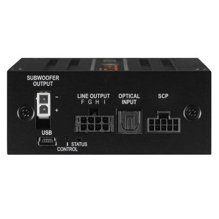 Den ekstremt kraftige 64-bits lydsignalprosessoren tilbyr ni DSP-kanaler. Fire fritt konfigurerbare RCA-utganger gjør det mulig å koble til ekstra forsterkere. Dette muliggjør komplekse og plassbesparende flerkanalssystemer med enorm ytelse.
