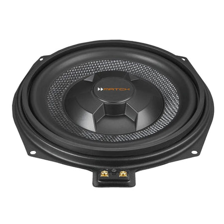 Til forskjell fra Nivå 1 pakken har vi her valgt å legge til en ny og bedre basshøyttaler som erstatter den originale basshøyttaleren i original basskasse i bagasjerommet. Ny basshøyttaler fra Match passer rett inn i original posisjon og kobles til på original plugg ved hjelp av et lite medfølgende overgangsstykke. Den nye basshøyttaleren har en vesentlig bedre og bredere frekvensrespons, samt at den tåler litt mer krefter. Dette gjør at man klarer å skape et hakket bedre og mer vellåtende bassfundament enn man får med Nivå 1 pakken.