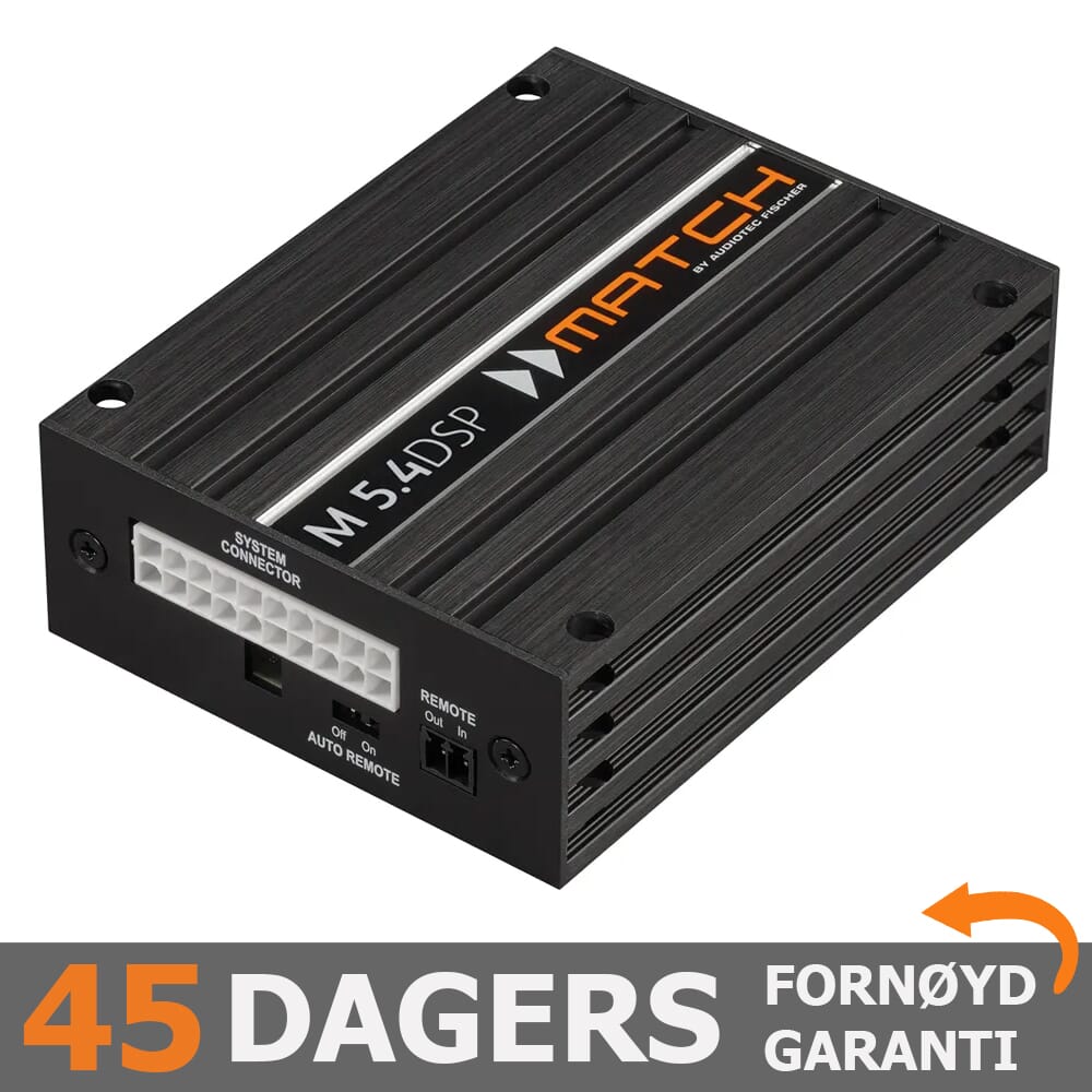På dette produktet gir Bass Brothers AS deg hele 45 dagers 100% Fornøydgaranti. Dette medfører at produktet kan returneres til oss innen 45 dager - uten spørsmål, og pengene tilbake på kontoen. Ingen krav til bytte eller tilgodelapp, kun at du selv må dekke returfrakt. Vi refunderer altså hele kjøpesummen tilbake til deg dersom du ikke skulle bli fornøyd. Match M5.4DSP er en forsterker vi bruker i svært mange av våre bilspesifikke pakker, og et produkt vi føler oss trygg på at du som kunde vil bli fornøyd med. Skulle du likevel ikke bli fornøyd, så kan det skyldes feil innstillinger i lydprosessoren, eller et lydoppsett som ikke er satt opp til akkurat din smak. I slike tilfeller anbefaler vi at du tar kontakt med oss på messenger, slik at vi kan hjelpe deg med oppsett eller sende deg en ferdig lydfil. Dette er selvsagt ikke et krav, og vi stiller som sagt ingen spørsmål om du ønsker å returnere. |