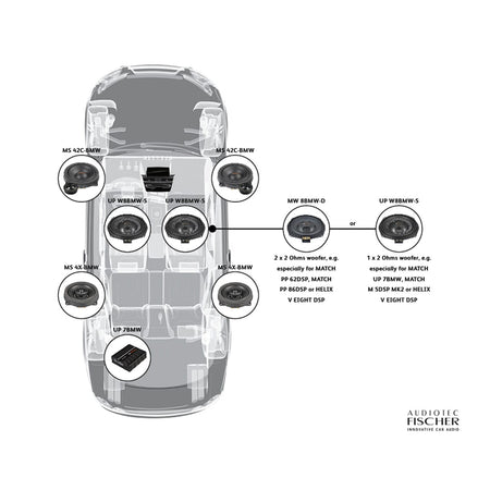 Koblingsmuligheter 2 ohm pr subwoofer. For bruk med forsterkere som er stabil i 2 ohm eller høyere motstand. Spesielt egnet for kombinasjon med Match UP DSP-forsterkere, UP 7BMW, UP 7DSP, UP 8DSP, UP 10DSP.