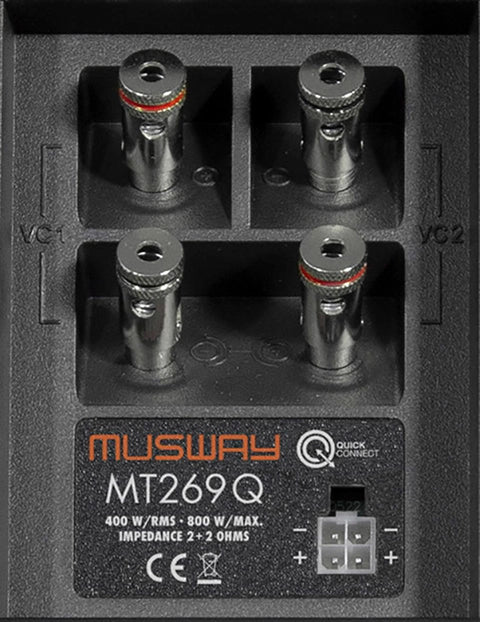 Kassen er utstyrt med både vanlige terminaler og hurtigkoblinger. Til hutigkoblingene kan det brukes en kabel som kan kobles på en hvilken som helst forsterker, eller en kan bruke en kabel med hurtigkobling i begge ender som passer perfekt med Musway forsterkere som har egen utgang for hurtigkobling.