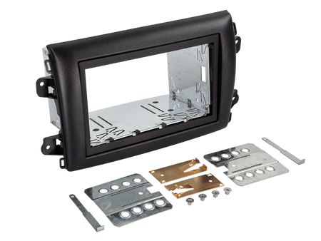 Rammen leveres i sort utførelse og inkluderer dobbel DIN-innsats med nødvendig tilbehør og monteringsbur.
